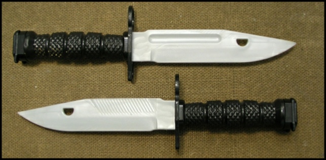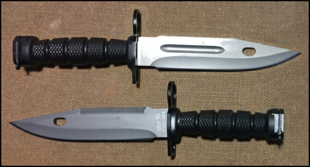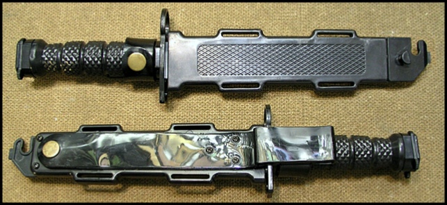 Training/toy bayonet #2. Blade is rubber, bayonet fixes to rifle, scabbard has wire cutter assembly.
