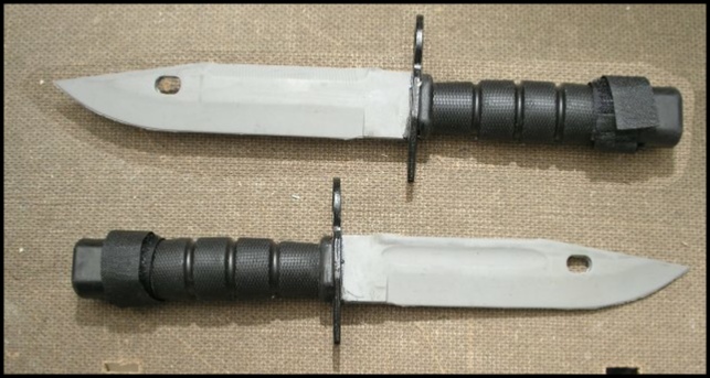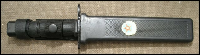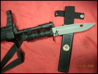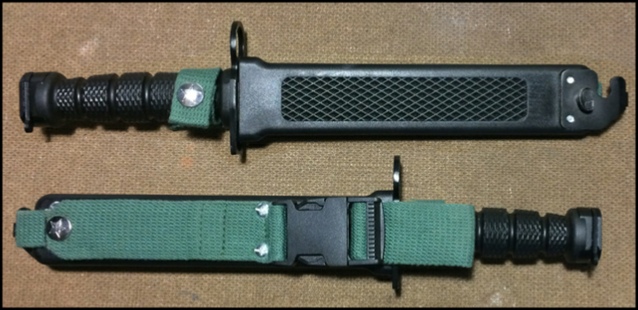 Training/toy bayonet. Blade is rubber, bayonet fixes to rifle with velcro band and scabbard does not have wire cutter assembly.